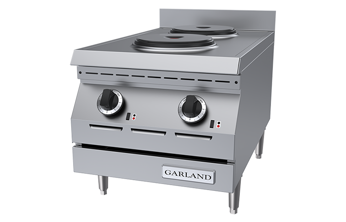 Garland Designer Series Medium-Duty Electric Hot Plates deliver flexible, reliable cooking performance for a variety of kitchen setups. Designed for use as a free-standing unit or banked with other Designer Series equipment, they easily integrate into existing kitchen lines. Sealed, high-performance elements provide consistent heat and are individually controlled for precise cooking. Heat-on indicator lamps offer clear visual status for safe operation. The 7.5" elements produce 2.0 kW of power, while the 9 inch elements deliver 2.6 kW for higher output when needed. A six-heat switch control provides versatile temperature settings and automatically reduces power to low heat if an element is left unused, helping conserve energy and extend element life.