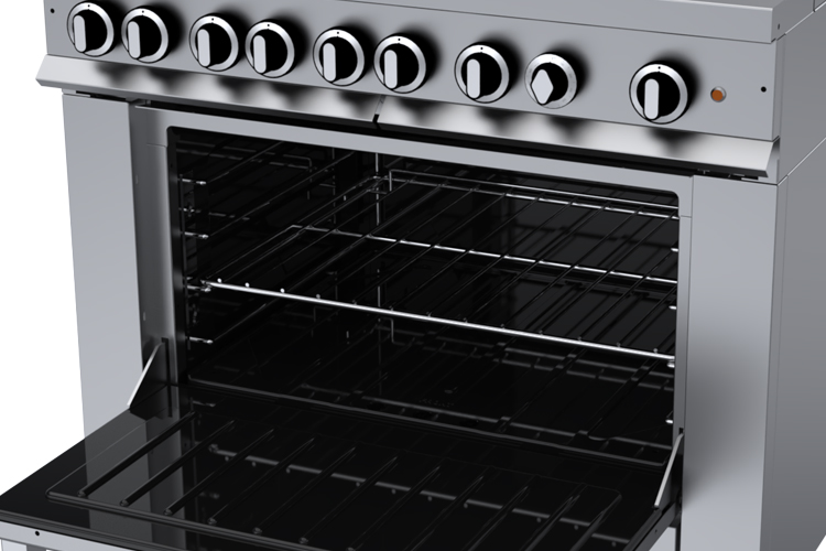 A full-sized 6.5 kW oven with aluminized steel interior. Separate power control for two upper heaters and two lower heaters with overall thermostatic oven control. Comes with a chrome-plated oven rack and 4-position rack guides. Storage base in lieu of oven also available.
