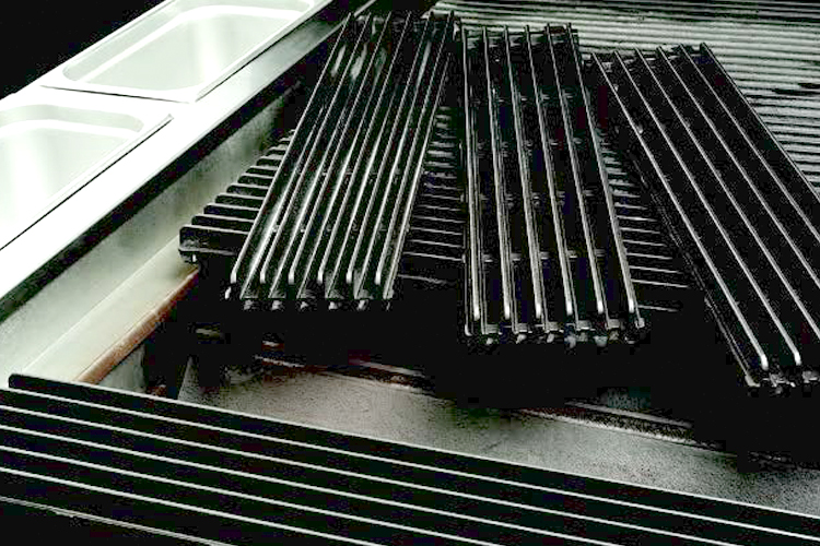 Cast-iron grill grates are sectioned to allow for easy removal and handling. Large capacity drip trays slide out for easy cleaning and maintenance. All stainless steel exterior wipes down with ease.