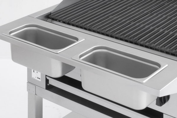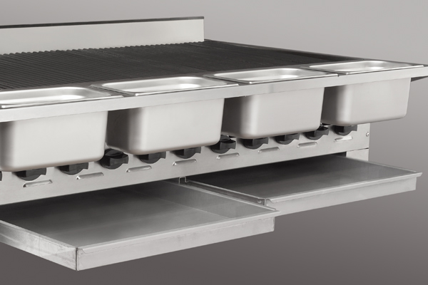A stainless steel front rail with cut outs to hold 1/3 and 1/9 size food pans at the front of the broiler keeps your bastes, oils, spices, and other ingredients within reach.