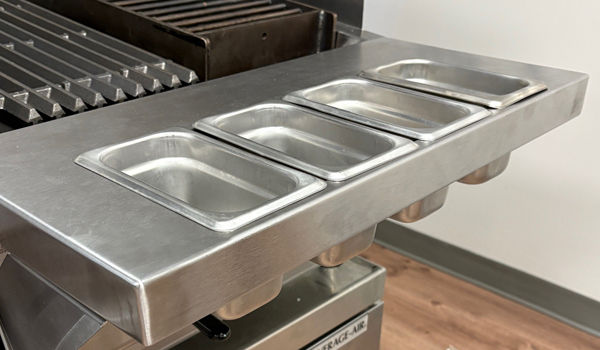Keep frequently used ingredients within arm’s reach of the cooking area with an optional removable stainless steel condiment rail with cut-outs for 1/9 or 1/3 pans. Keeps the cooking area organized, helping chefs work faster and more efficiently.