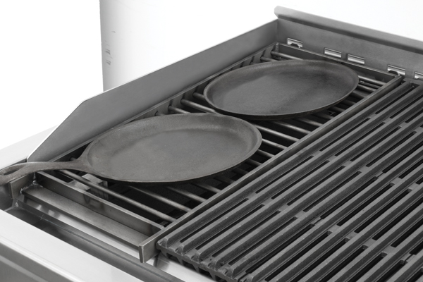 - Reversible cast-iron broiler grates in 3” wide sections with 1/8” and 3/16” wide brands